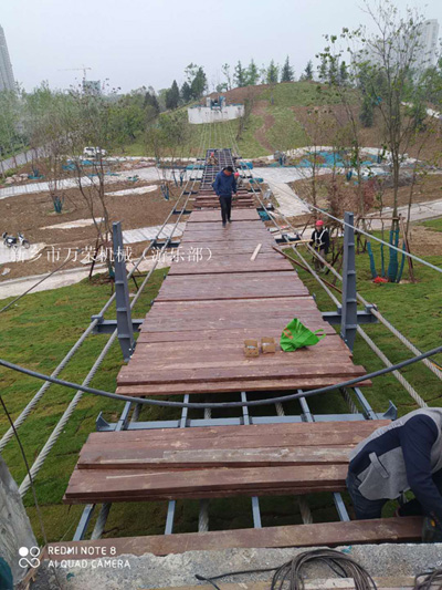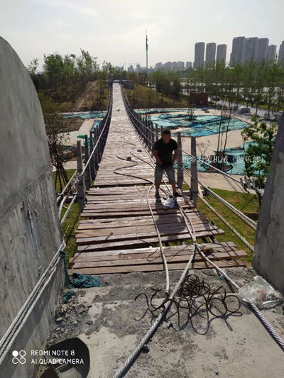 吊橋生產(chǎn)廠家總體布置本橋全長115.116m,寬249m,橋面下共設(shè)4根6x55wNS+WR4621670鋼芯鋼絲繩承重索,承重索兩側(cè)各設(shè)2根6x55sWS+WR621670鋼芯鋼絲繩,作為穩(wěn)定索。