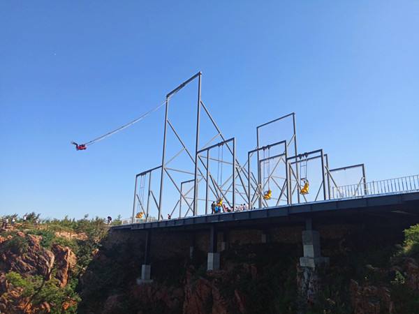 懸崖秋千是一個(gè)門型支架,由六根鋼管形成支撐,鋼管被牢牢的固定在懸崖內(nèi)防止門型支架移位。